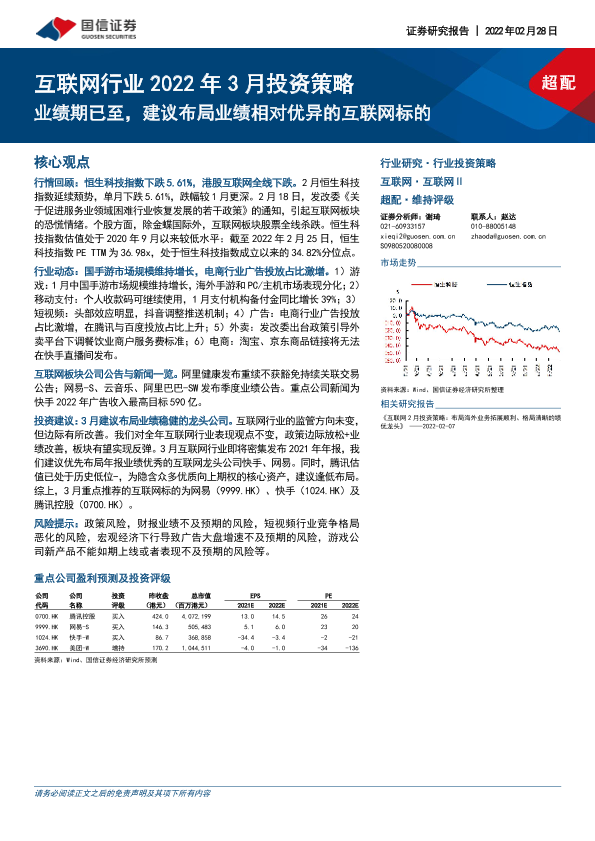 【国信证券】【20220228】互联网行业2022年3月投资策略:业绩期已至,建议布局业绩相对优异的互联网标的-18页