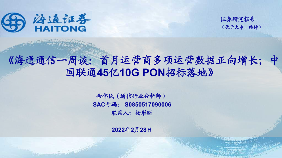 【海通证券】【20220228】海通通信一周谈:首月运营商多项运营数据正向增长;中国联通45亿10GPON招标落地-13页