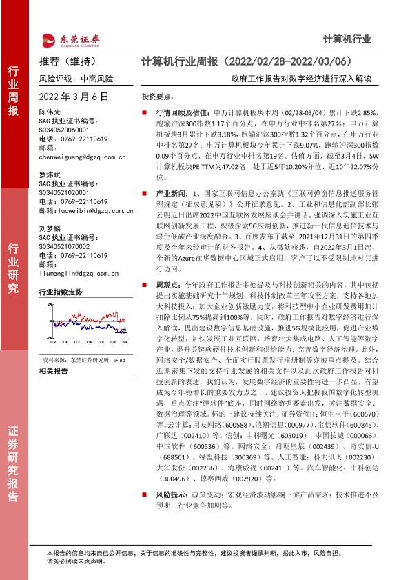 【东莞证券】【20220306】计算机行业周报:政府工作报告对数字经济进行深入解读-8页