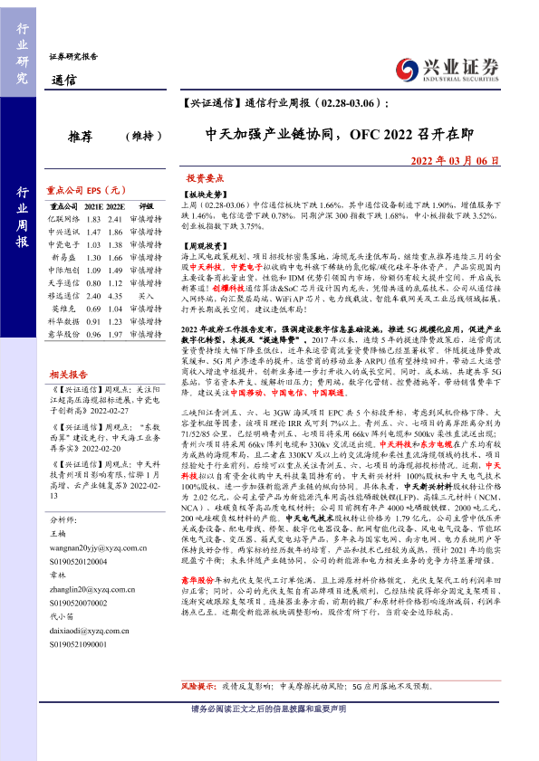 【兴业证券】【20220306】通信行业周报(02.28-03.06):中天加强产业链协同,OFC 2022召开在即-11页