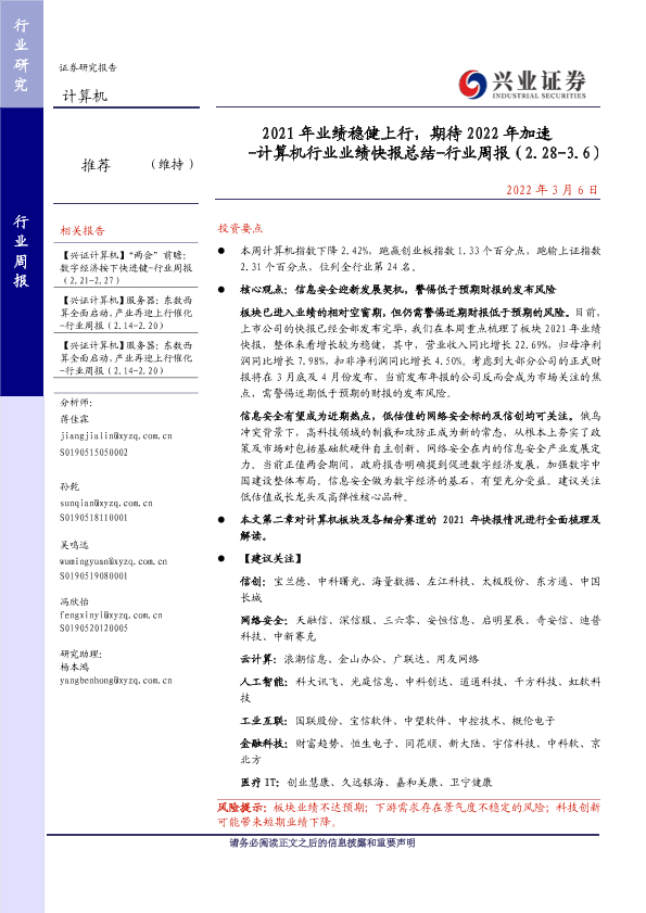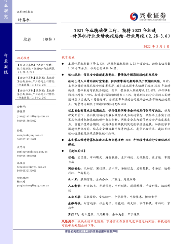 【兴业证券】【20220306】2021年业绩稳健上行,期待2022年加速 - 计算机行业业绩快报总结-行业周报(2.28-3.6)-22页