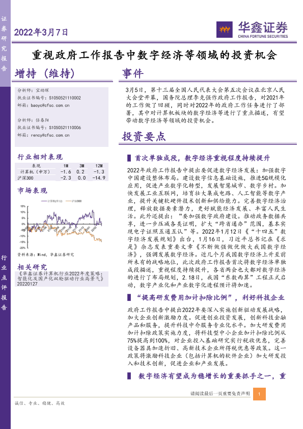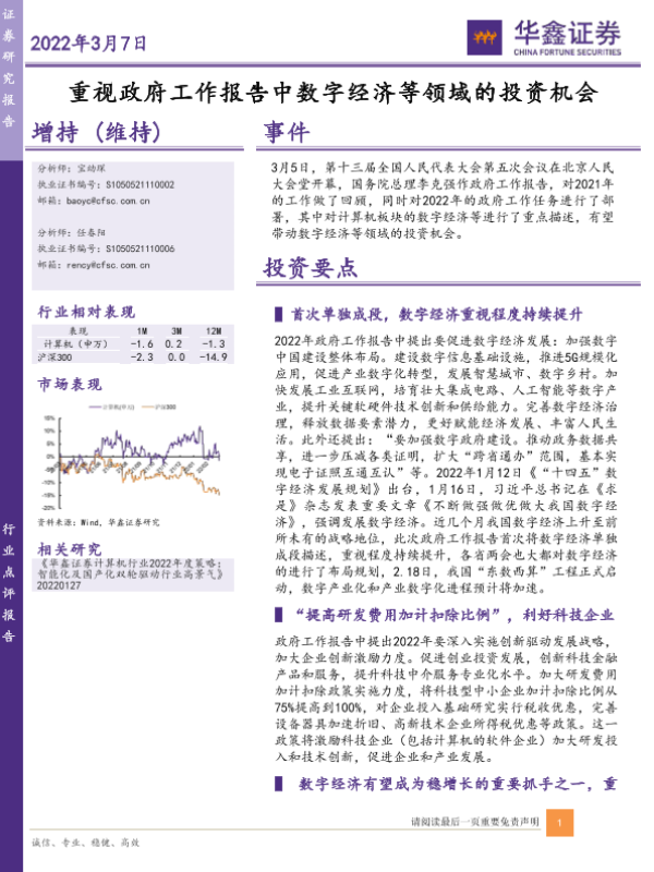 【华鑫证券】【20220307】20220307-华鑫证券-计算机行业点评报告:重视政府工作报告中数字经济等领域的投资机会-5页