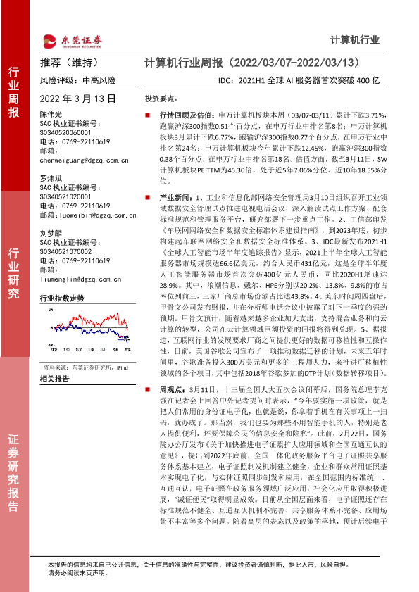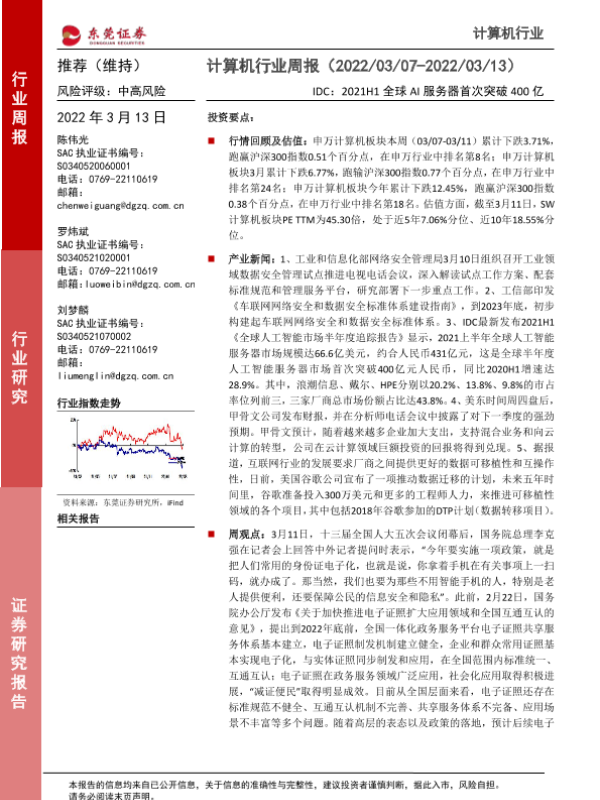 【东莞证券】【20220313】计算机行业周报:IDC:2021H1全球AI服务器首次突破400亿-10页
