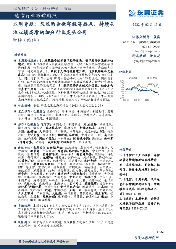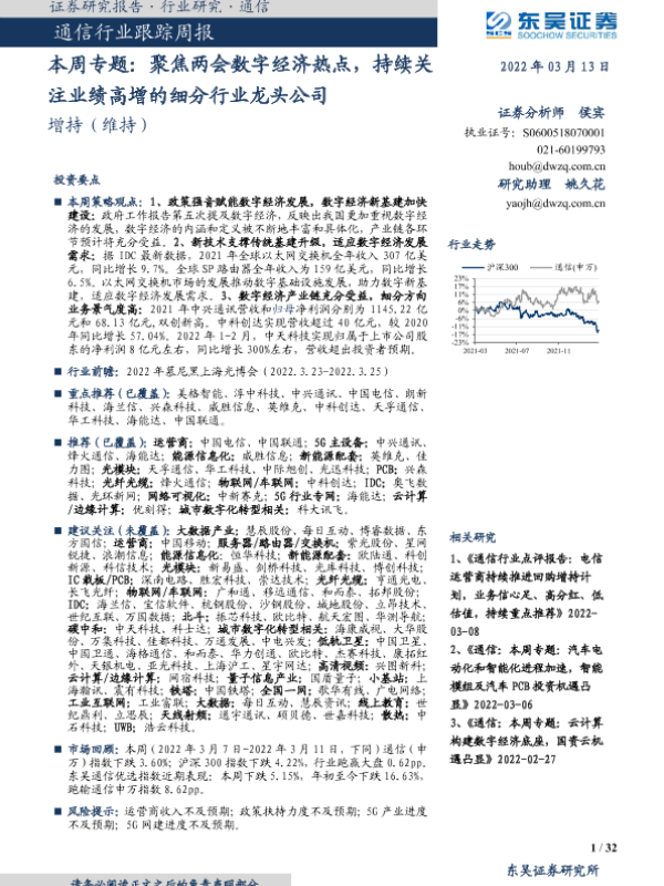 【东吴证券】【20220313】通信行业跟踪周报:聚焦两会数字经济热点,持续关注业绩高增的细分行业龙头公司-32页