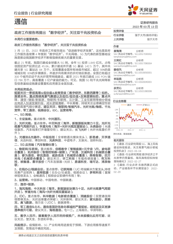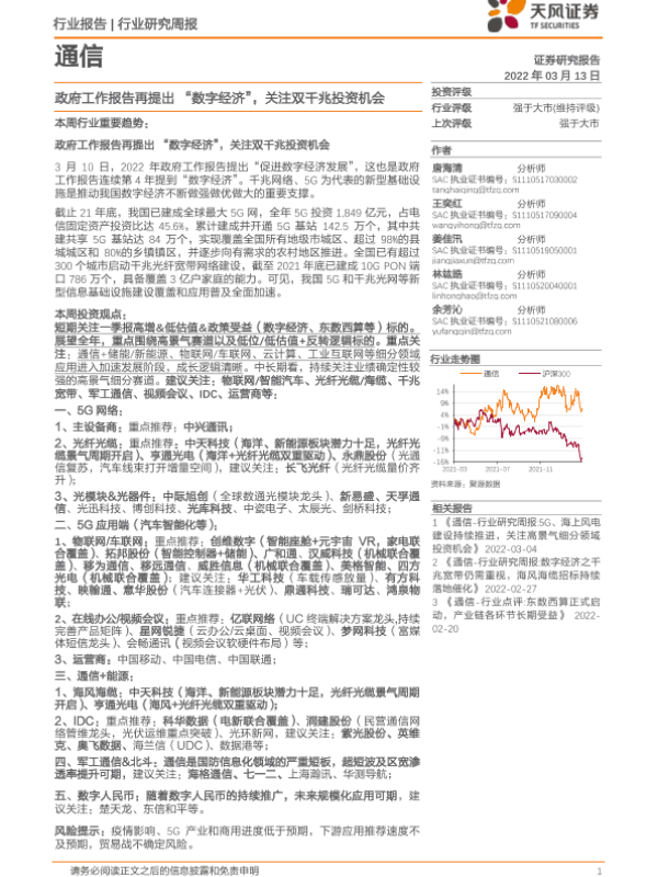 【天风证券】【20220313】通信行业研究周报:政府工作报告再提出“数字经济”,关注双千兆投资机会-11页