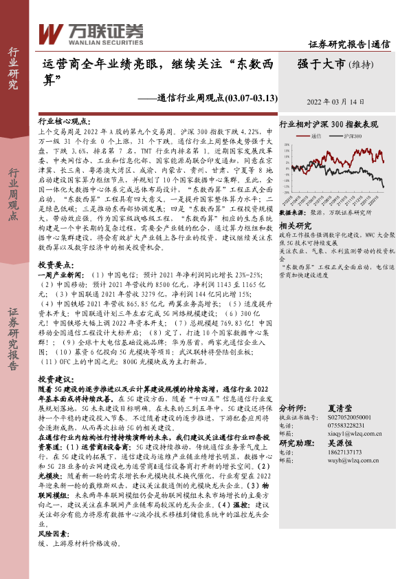 【万联证券】【20220314】20220314-万联证券-通信行业周观点:运营商全年业绩亮眼,继续关注“东数西算”-13页