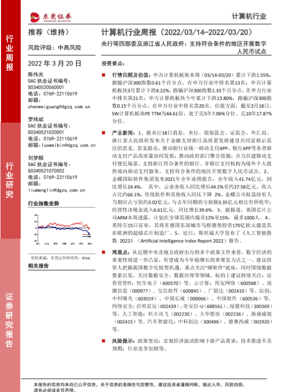 【东莞证券】【20220320】20220320-东莞证券-计算机行业周报:央行等四部委及浙江省人民政府:支持符合条件的地区开展数字人民币试点-8页