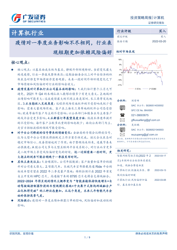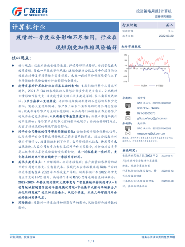 【广发证券】【20220320】20220320-广发证券-计算机行业投资策略周报:疫情对一季度业务影响不尽相同,行业表现短期更加依赖风险偏好-9页
