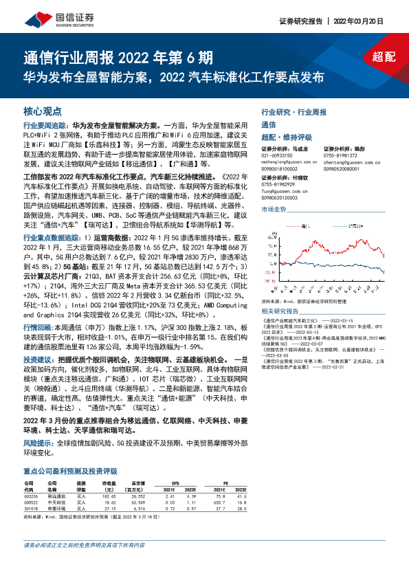 【国信证券】【20220320】通信行业周报2022年第6期:华为发布全屋智能方案,2022汽车标准化工作要点发布-30页