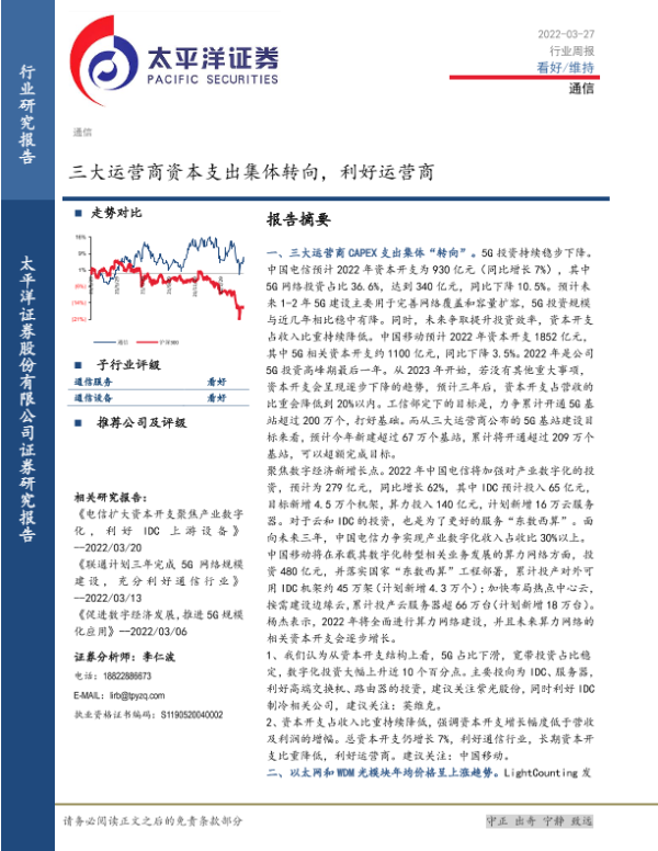 【太平洋证券】【20220327】通信行业周报:三大运营商资本支出集体转向,利好运营商-22页