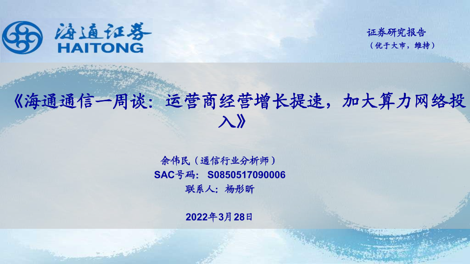 【海通证券】【20220328】海通通信一周谈:运营商经营增长提速,加大算力网络投入-13页