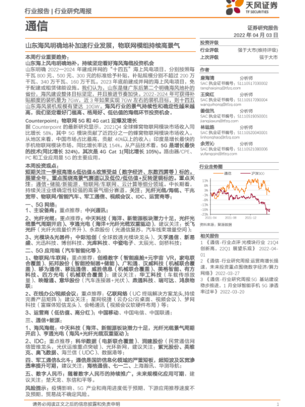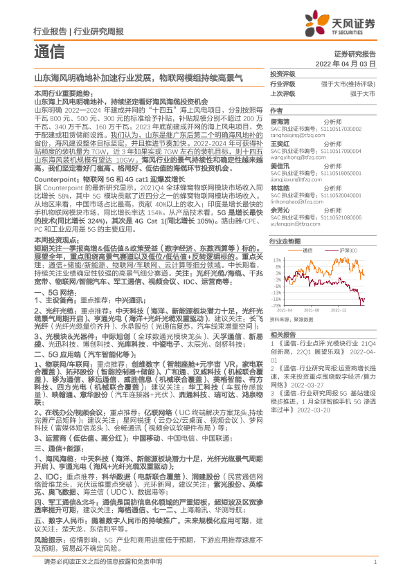 【天风证券】【20220403】20220403-天风证券-通信行业研究周报:山东海风明确地补加速行业发展,物联网模组持续高景气-10页