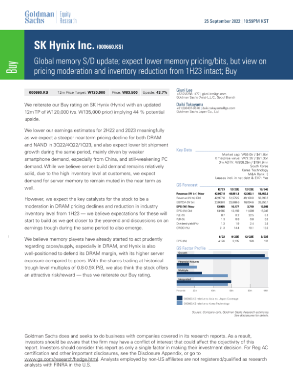 【Goldman Sachs】【20220925】Global memory S/D update; expect lower memory pricing/bits, but view on pricing moderation and inventory reduction from 1H23 intact; Buy-15页