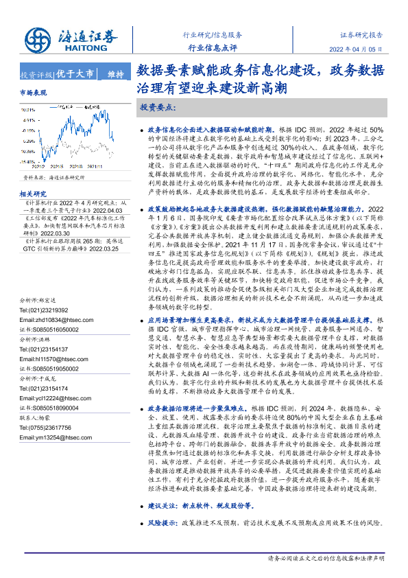 【海通证券】【20220405】信息服务行业信息点评:数据要素赋能政务信息化建设,政务数据治理有望迎来建设新高潮-2页