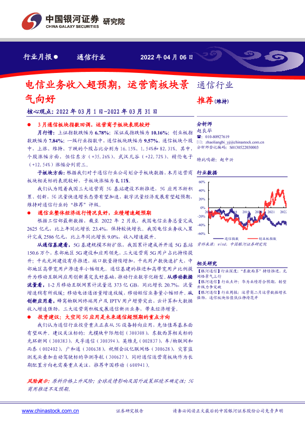 【银河证券】【20220406】通信行业月报:电信业务收入超预期,运营商板块景气向好-16页