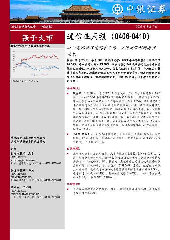 【中银证券】【20220407】通信业周报:华为背水而战建鸿蒙生态,重研发促创新再获生机-24页