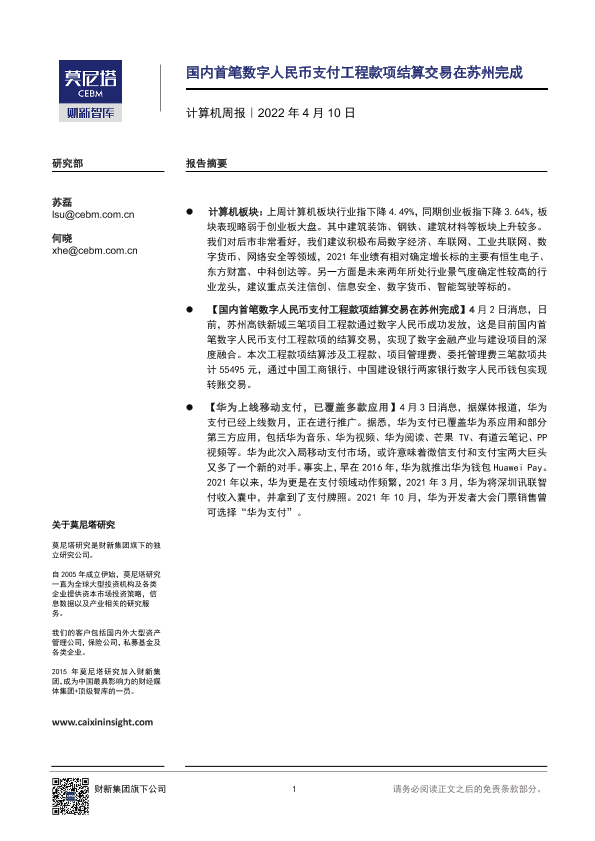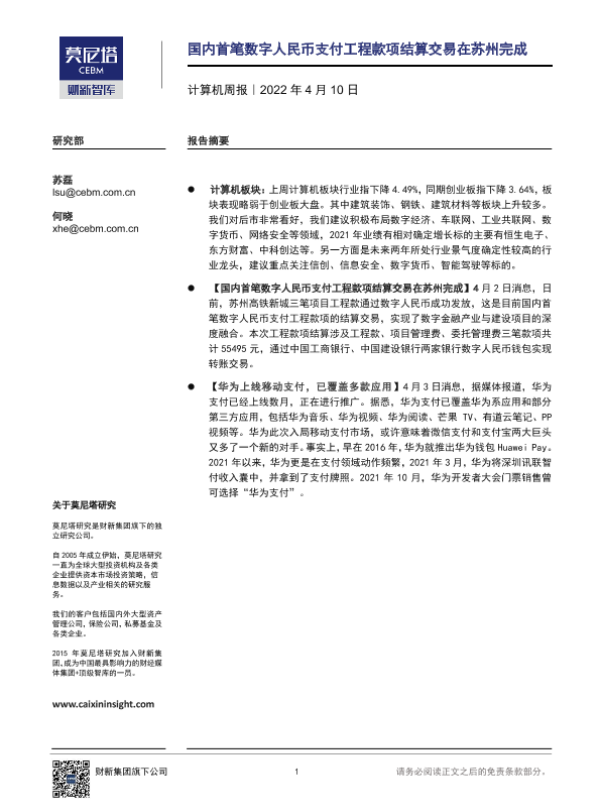【莫尼塔研究】【20220410】国内首笔数字人民币支付工程款项结算交易在苏州完成-6页