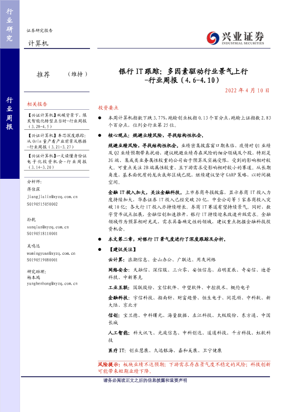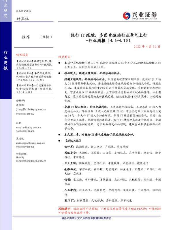 【兴业证券】【20220410】银行 IT跟踪:多因素驱动行业景气上行 -行业周报(4.6-4.10)-17页
