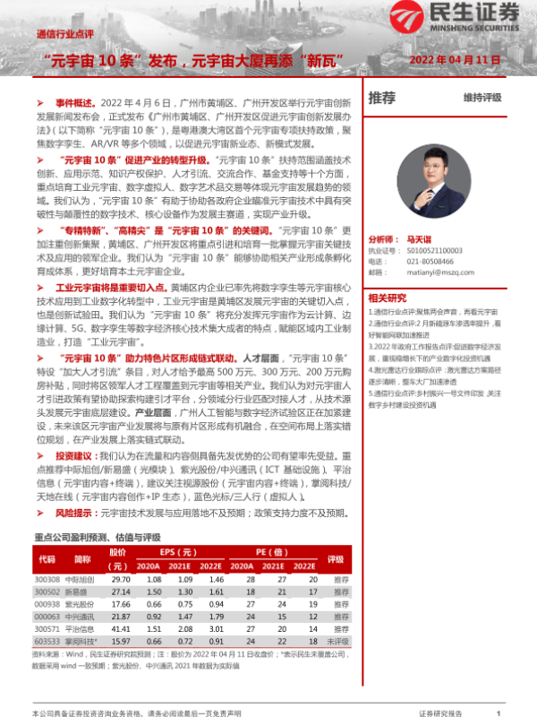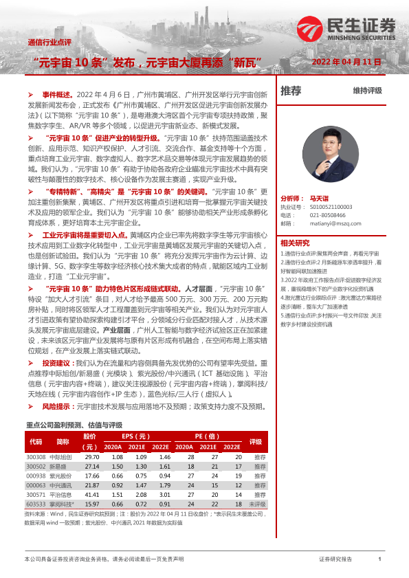 【民生证券】【20220411】通信行业点评:“元宇宙10条”发布,元宇宙大厦再添“新瓦”-2页