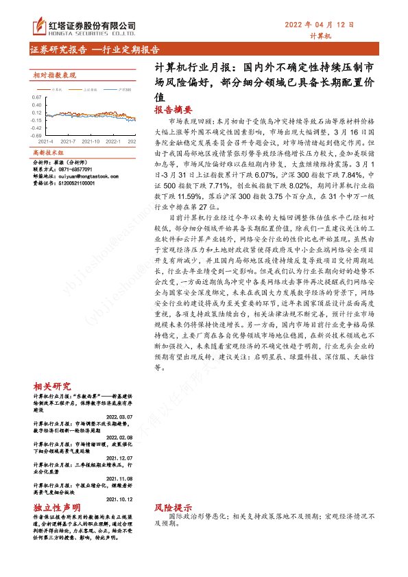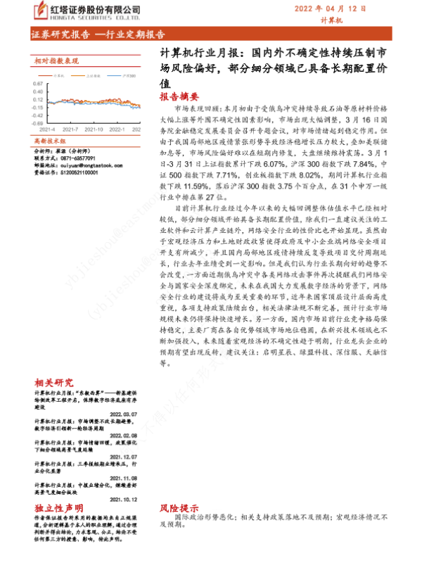【红塔证券】【20220412】计算机行业月报:国内外不确定性持续压制市场风险偏好,部分细分领域已具备长期配置价值-14页