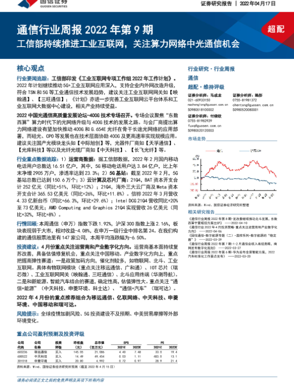 【国信证券】【20220417】通信行业周报2022年第9期:工信部持续推进工业互联网,关注算力网络中光通信机会-28页