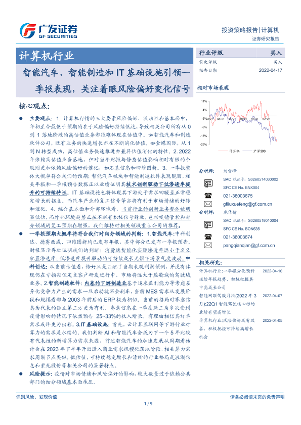 【广发证券】【20220417】20220417-广发证券-计算机行业投资策略报告:智能汽车、智能制造和IT基础设施引领一季报表现,关注着眼风险偏好变化信号-9页