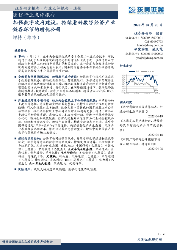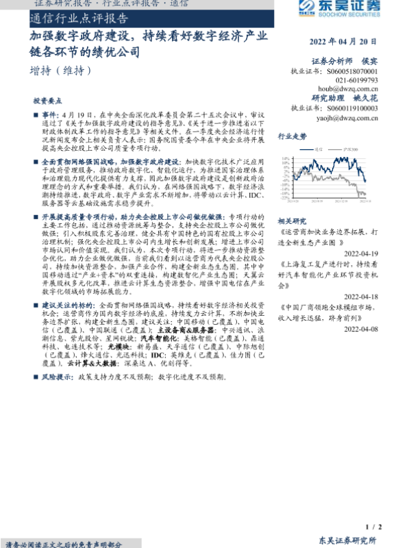 【东吴证券】【20220420】通信行业点评报告:加强数字政府建设,持续看好数字经济产业链各环节的绩优公司-2页