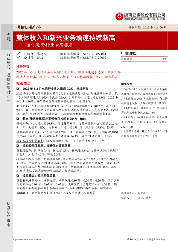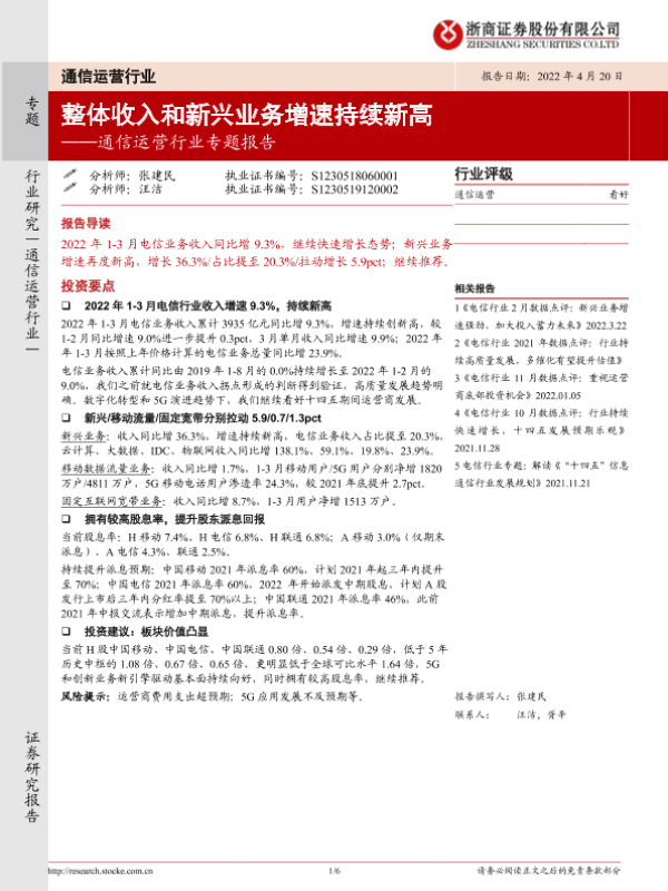 【浙商证券】【20220420】通信运营行业专题报告:整体收入和新兴业务增速持续新高-6页