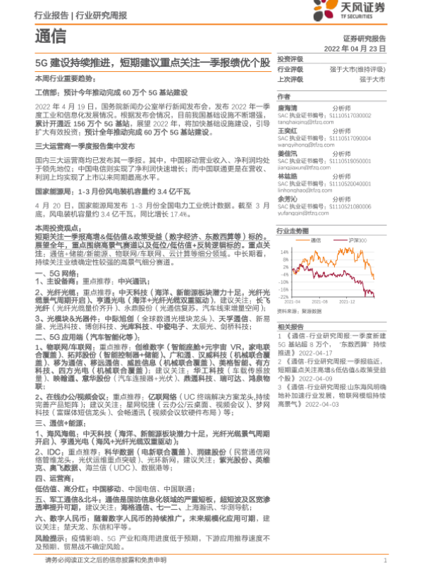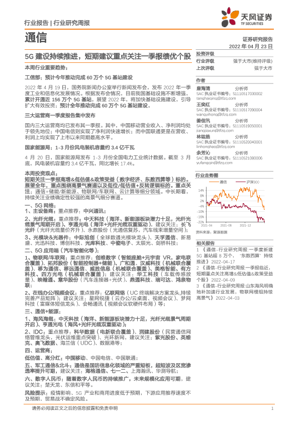 【天风证券】【20220423】20220423-天风证券-通信行业研究周报:5G建设持续推进,短期建议重点关注一季报绩优个股-12页