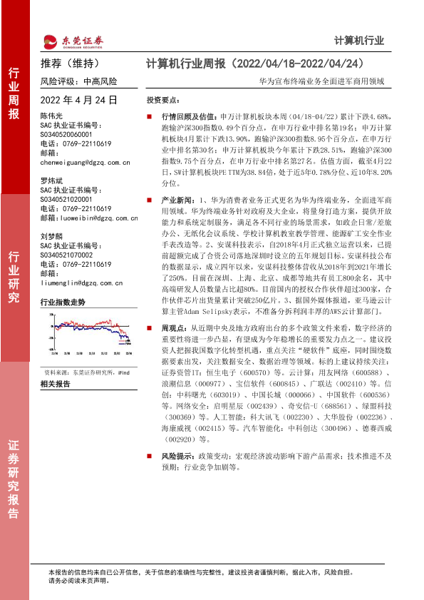 【东莞证券】【20220424】计算机行业周报:华为宣布终端业务全面进军商用领域-7页