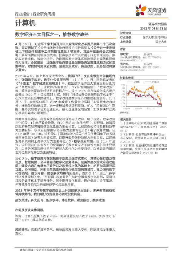 【天风证券】【20220423】计算机行业研究周报:数字经济五大目标之一,推荐数字政务-6页