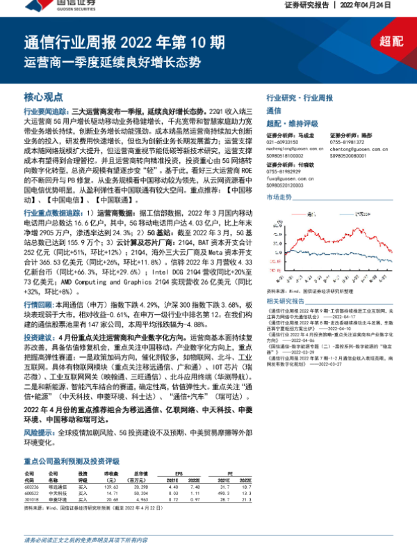 【国信证券】【20220424】通信行业周报2022年第10期:运营商一季度延续良好增长态势-24页