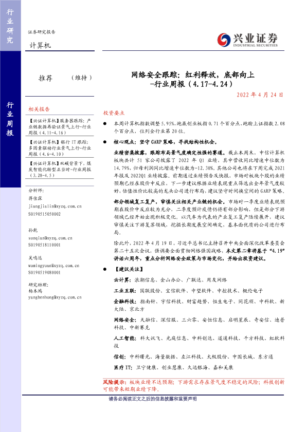 【兴业证券】【20220424】网络安全跟踪:红利释放,底部向上 -行业周报(4.17-4.24)-23页