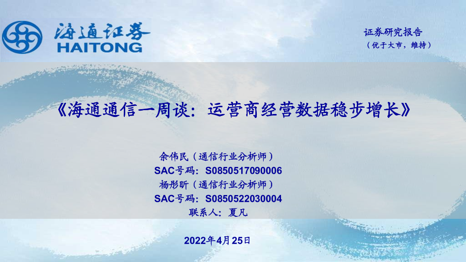 【海通证券】【20220425】海通通信一周谈:运营商经营数据稳步增长-13页