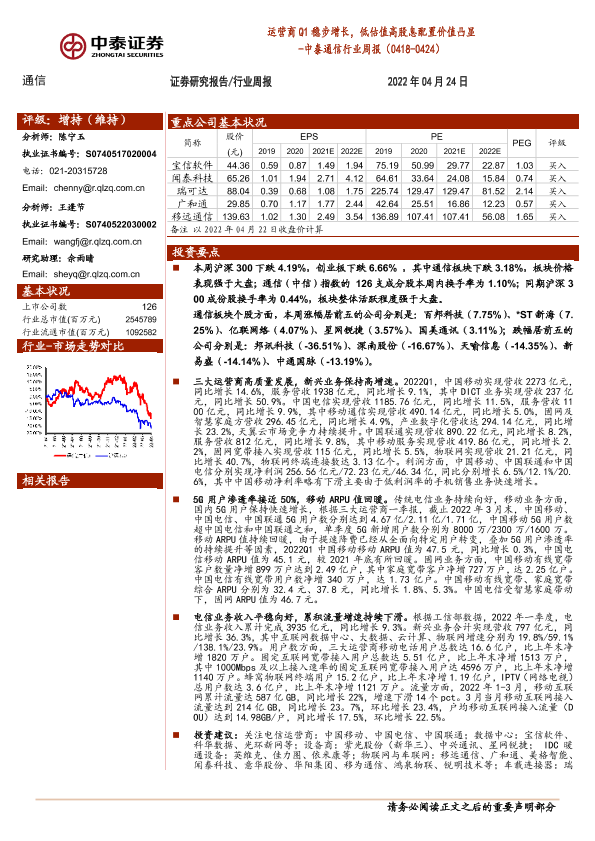 【中泰证券】【20220424】中泰通信行业周报:运营商Q1稳步增长,低估值高股息配置价值凸显-21页