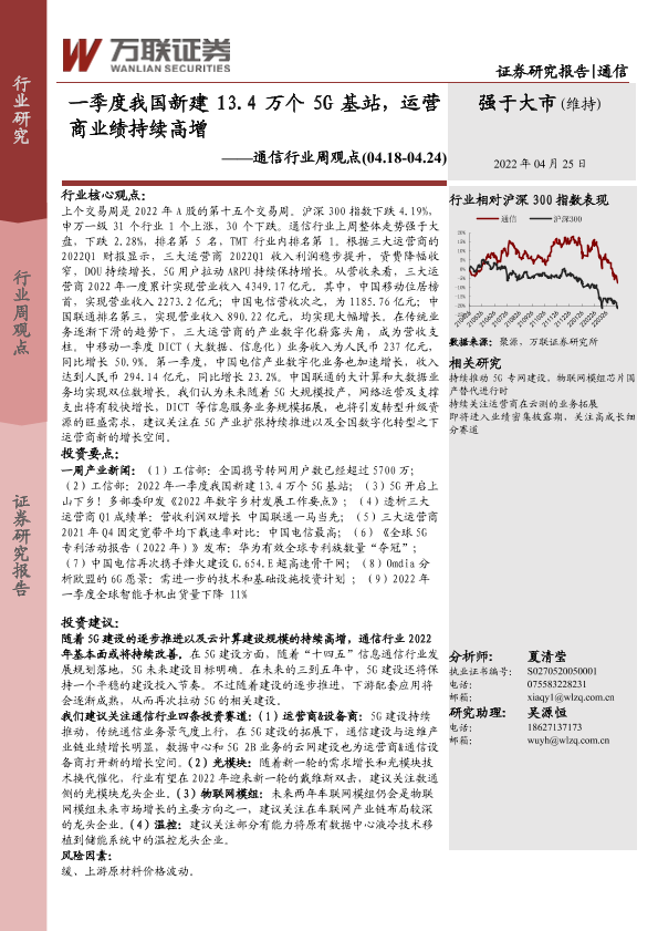 【万联证券】【20220425】一季度我国新建13.4万个5G基站,运营商业绩持续高增-15页