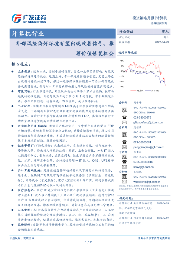 【广发证券】【20220429】计算机行业:外部风险偏好环境有望出现改善信号、推荐价值修复机会-10页