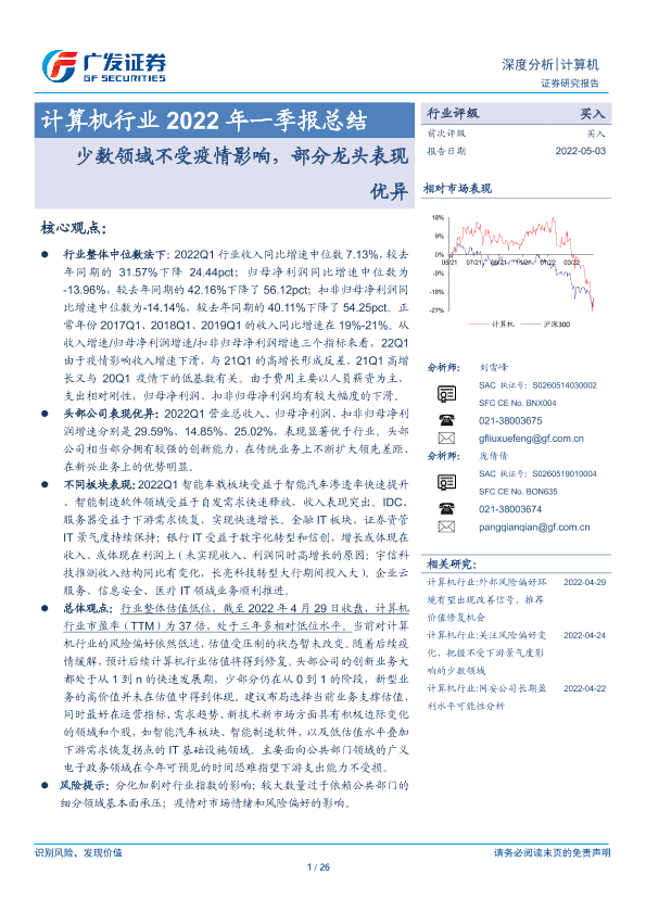 【广发证券】【20220503】计算机行业2022年一季报总结:少数领域不受疫情影响,部分龙头表现优异-26页