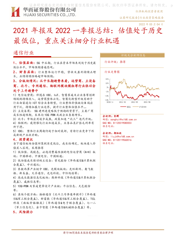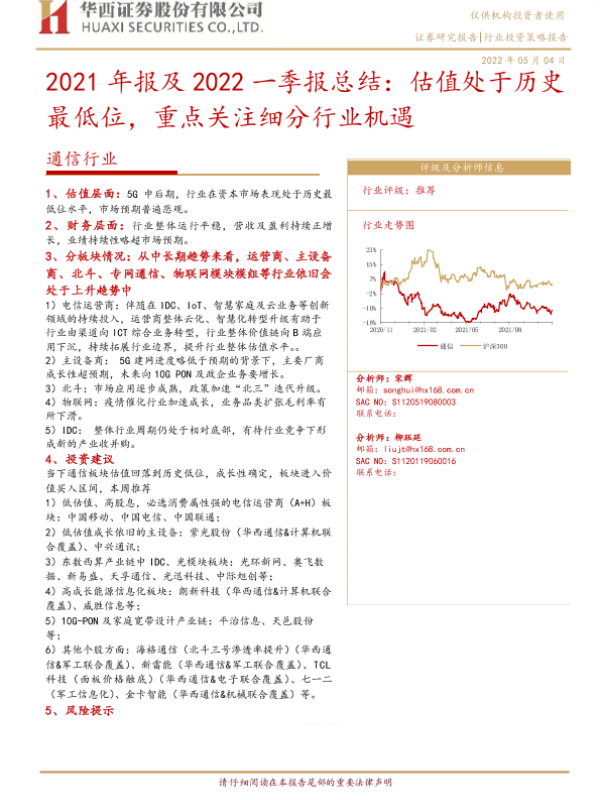 【华西证券】【20220504】20220504-华西证券-通信行业2021年报及2022一季报总结:估值处于历史最低位,重点关注细分行业机遇-17页