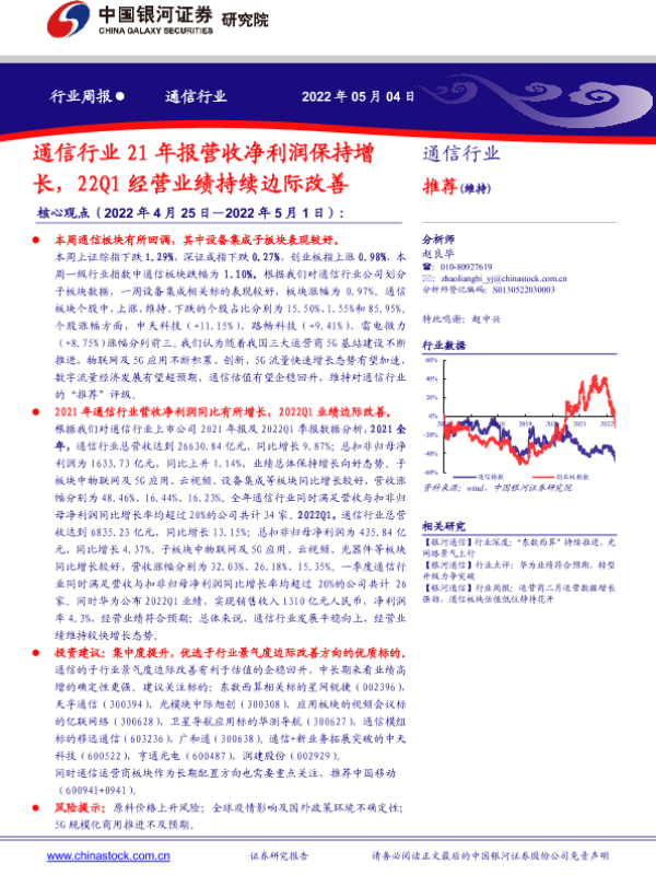 【银河证券】【20220504】通信行业周报:通信行业21年报营收净利润保持增长,22Q1经营业绩持续边际改善-22页
