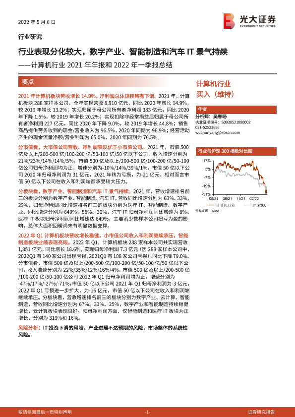 【光大证券】【20220506】计算机行业2021年年报和2022年一季报总结:行业表现分化较大,数字产业、智能制造和汽车IT景气持续-15页