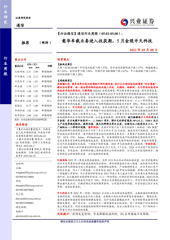 【兴业证券】【20220508】通信行业周报(05.02-05.08):意华车载业务进入收获期,5月金股中天科技-13页