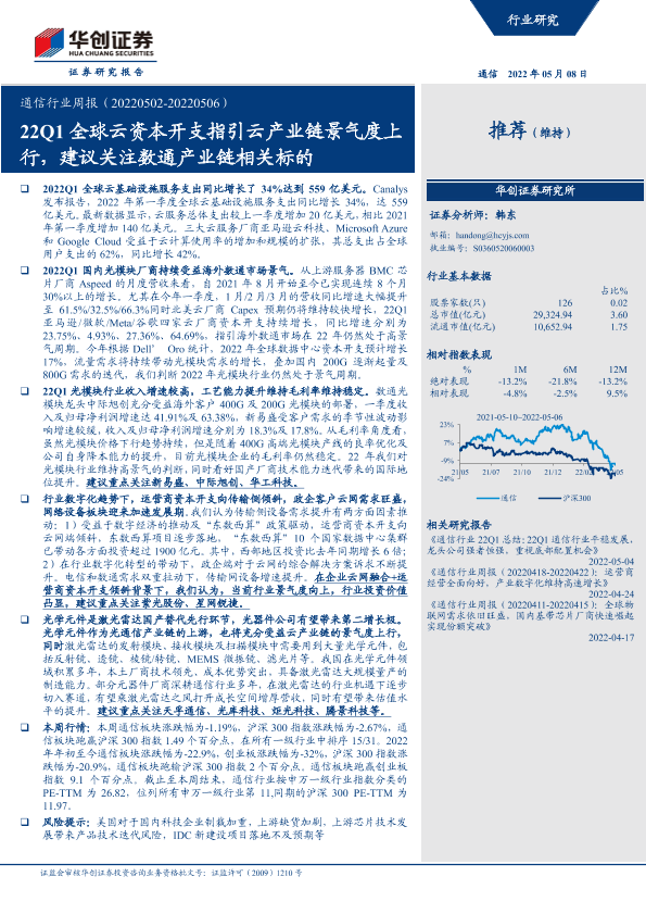 【华创证券】【20220508】20220508-华创证券-通信行业周报:22Q1全球云资本开支指引云产业链景气度上行,建议关注数通产业链相关标的-18页