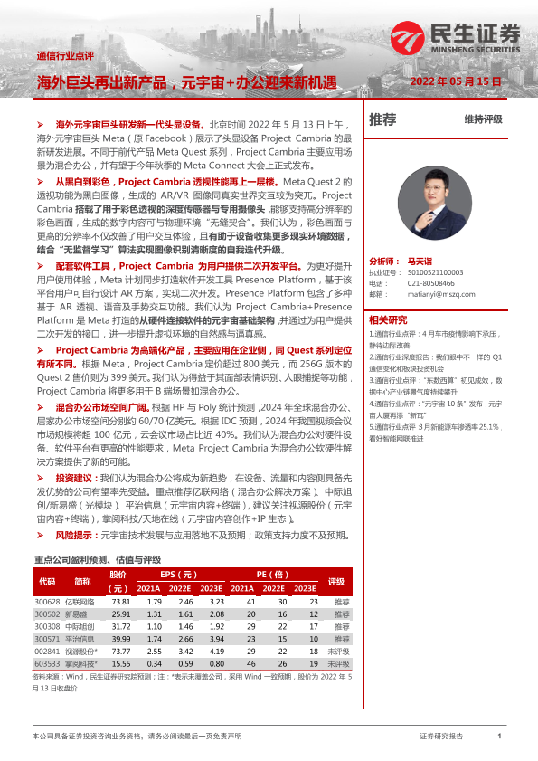 【民生证券】【20220515】通信行业点评:海外巨头再出新产品,元宇宙+办公迎来新机遇-2页