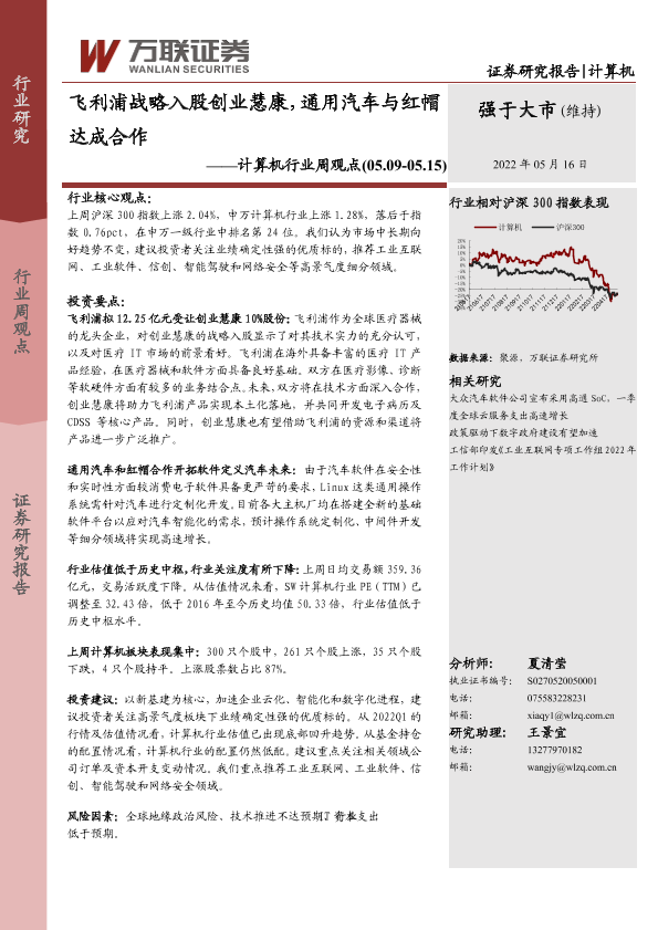 【万联证券】【20220516】20220516-万联证券-计算机行业周观点:飞利浦战略入股创业慧康,通用汽车与红帽达成合作-11页