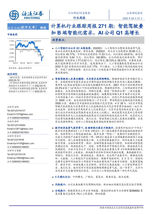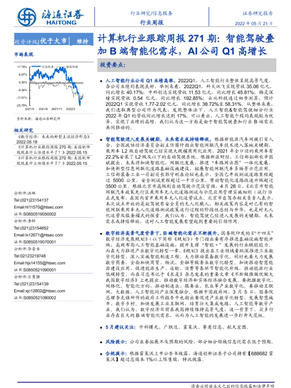 【海通证券】【20220521】计算机行业跟踪周报271期:智能驾驶叠加B端智能化需求,AI公司Q1高增长-3页