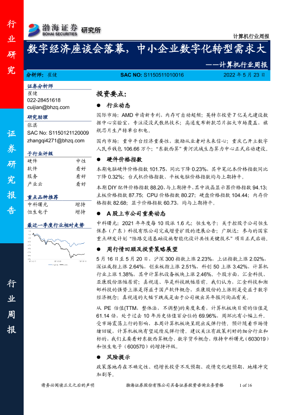 【渤海证券】【20220523】计算机行业周报:数字经济座谈会落幕,中小企业数字化转型需求大-16页
