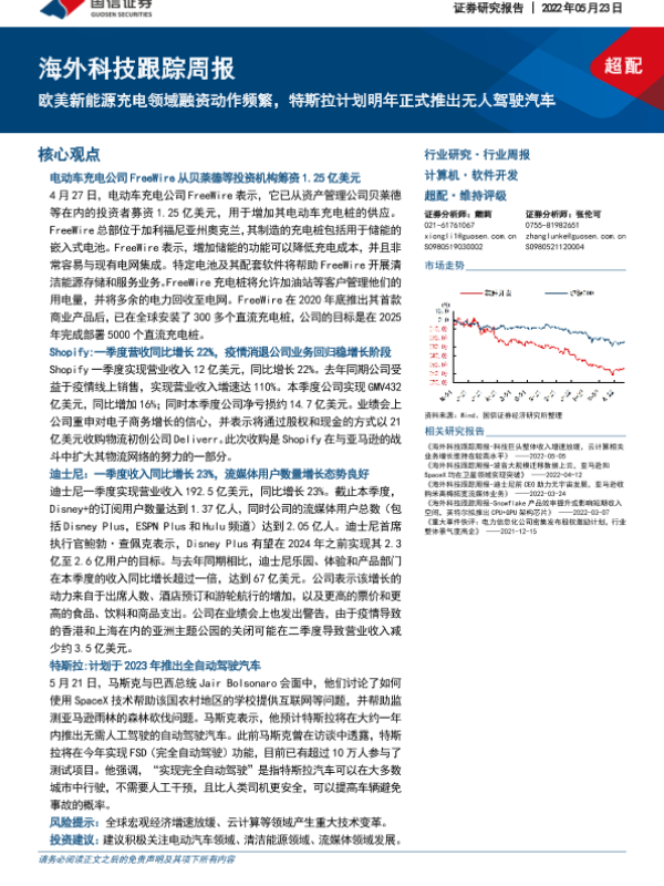 【国信证券】【20220523】海外科技跟踪周报:欧美新能源充电领域融资动作频繁,特斯拉计划明年正式推出无人驾驶汽车-7页
