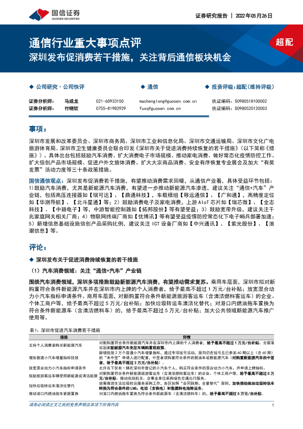 【国信证券】【20220526】通信行业重大事项点评:深圳发布促消费若干措施,关注背后通信板块机会-7页