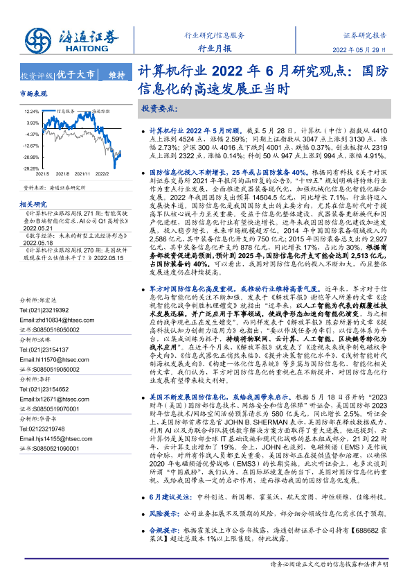 【海通证券】【20220529】计算机行业2022年6月研究观点:国防信息化的高速发展正当时-4页